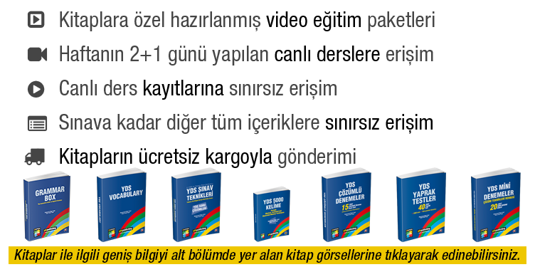 Yukardaki listede de yer aldığı gibi toplamda 9 parça kitap size ücretsiz kargo ile gönderilecektir. 1-Grammar Box, 2-YDS Vocabulary, 3-YDS Sınav Teknikleri, 4-YDS Çözümlü Denemeler, 5-YDS Mini Denemeler, 6-YDS Yaprak Testler, 7-5000 Kelime Kitapçığı 8-YÖKDİL Sınav Teknikleri ve Örnek Sınavlar Kitabı(Seçiminize Göre) 9-English Box (Ön Hazırlık Paketi için)